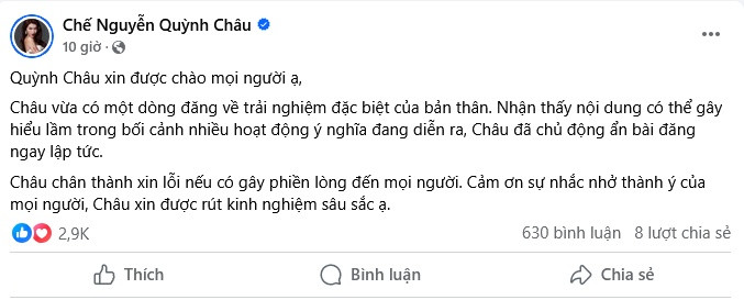 Ngay sau khi nhận được những ý kiến trái chiều từ dân mạng, Quỳnh Châu cũng lập tức lên tiếng xin lỗi trên trang cá nhân: