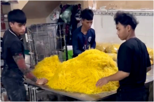 Vương Lưỡng Toàn khai mua hóa chất ở chợ Kim Biên về pha trộn để sản xuất sợi mì mềm dai, màu sắc bắt mắt. Mỗi ngày, cơ sở này sản xuất khoảng 700-800kg mì, bán cho các chủ sạp hàng ở chợ.