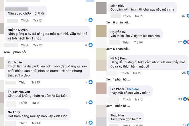 Trên MXH, netizen liên tục bày tỏ sự bất ngờ trước vẻ ngoài thăng hạng của Lâm Vỹ Dạ. Đa phần dân mạng đặt nghi vấn người đẹp mới can thiệp “dao kéo” để có visual cuốn hút như hiện tại. Cũng không ít người tin rằng, Lâm Vỹ Dạ mới giảm cân, kết hợp đổi tone make-up nên ngoại hình thay đổi.