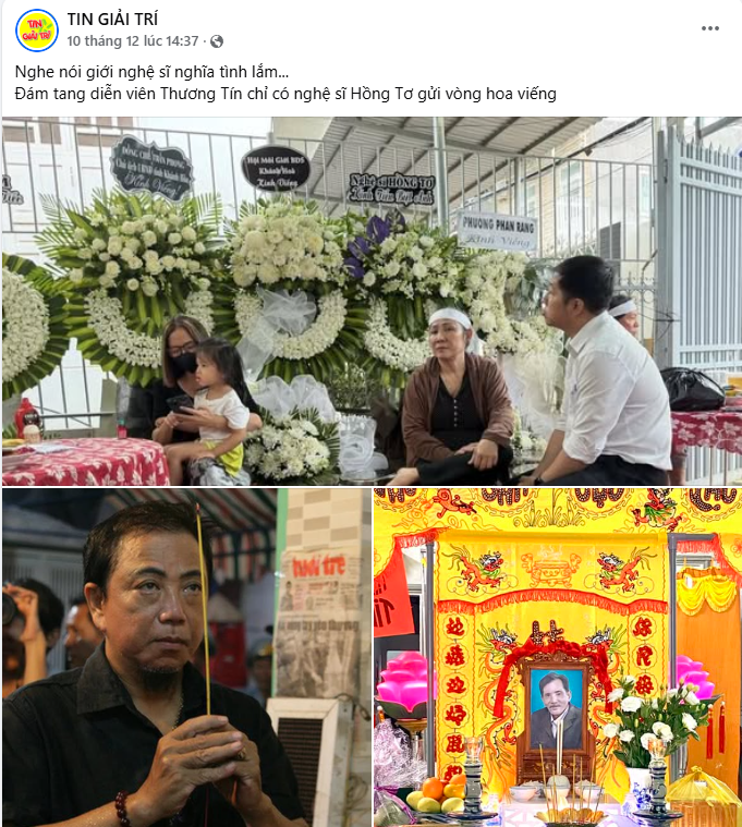 Nhạc sĩ Tô Hiếu cho biết tại lễ tang diễn viên Thương Tín, gia đình chỉ nhận được một vài vòng hoa viếng, trong đó có vòng hoa của chính nam nhạc sĩ và nghệ sĩ Hồng Tơ. “Cách đây ít phút, tôi nhận tin nghệ sĩ Hữu Nghĩa đã đặt một vòng hoa đề tên Nghệ sĩ TP.HCM kính viếng nhưng không kịp chuyển đến”, ông nói.