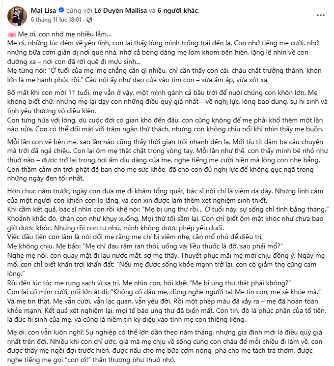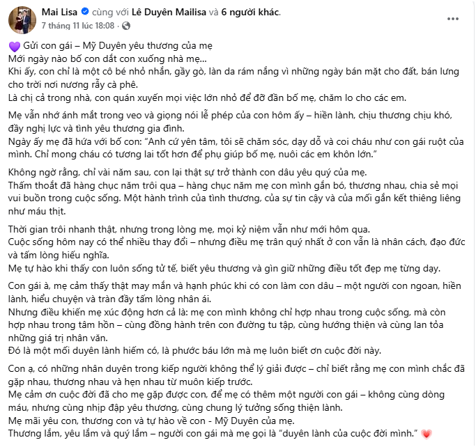 Trước đó Sếp Mailisa đã đăng tải lên bài yêu thương về đứa con dâu Duyên Mailisa và mẹ già